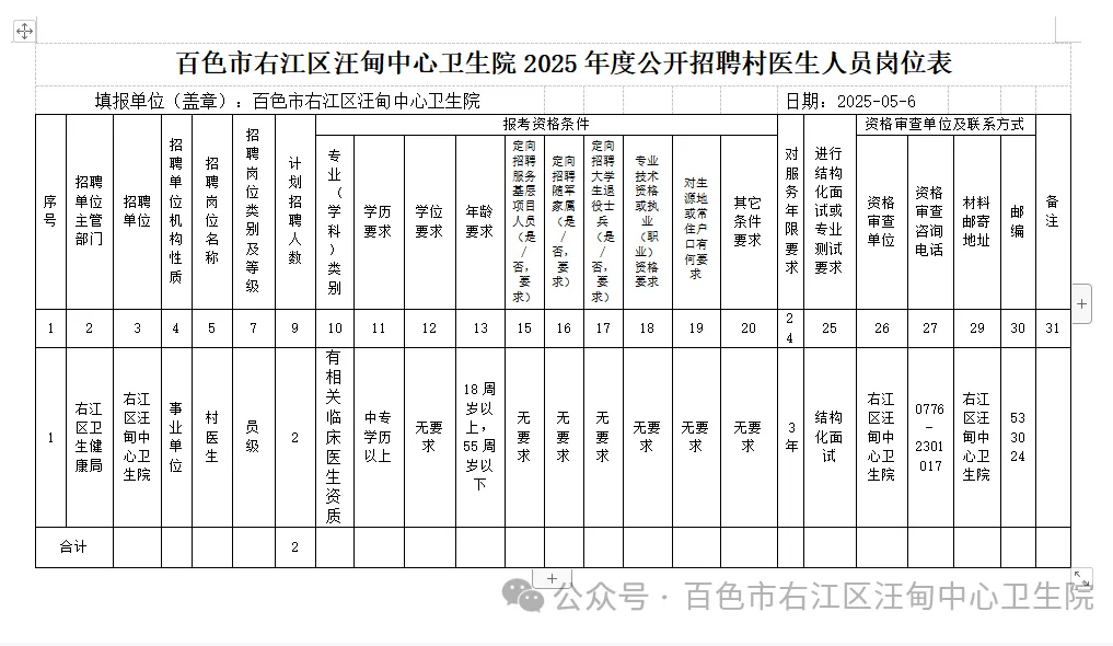 3.報名地點:百色市右江區(qū)汪甸中心衛(wèi)生院三樓辦公室,聯(lián)系人:林紅青 聯(lián)系電話:0776-2301017。因報名信息填寫錯漏等所造成的后果,本單位不負(fù)任何責(zé)任。