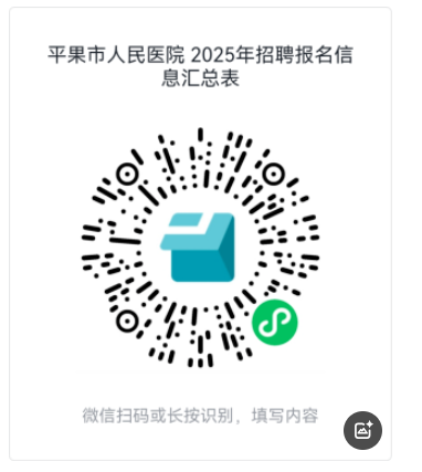 1.填寫提交紙質(zhì)版《平果市人民醫(yī)院2025年度公開招聘專業(yè)技術(shù)人員報名表》(附件3),并掃描下方二維碼填寫報名信息。