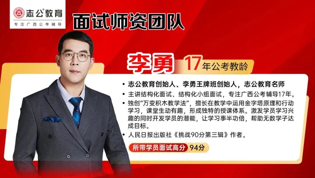 李勇——志公教育創(chuàng)始人、李勇王牌®班創(chuàng)始人,志公教育名師。主講結(jié)構(gòu)化面試、結(jié)構(gòu)化小組面試,專注廣西公考輔導(dǎo)17年。獨(dú)創(chuàng)“萬變積木教學(xué)法”,擅長在教學(xué)中運(yùn)用金字塔原理和行動學(xué)習(xí),課堂生動有趣,形成獨(dú)特的授課體系。激發(fā)學(xué)員學(xué)習(xí)興趣的同時開發(fā)學(xué)員的潛能,讓學(xué)習(xí)事半功倍,幫助無數(shù)學(xué)子達(dá)成目標(biāo)。同時也是人民日報(bào)出版社《挑戰(zhàn)90分第三輯》作者。