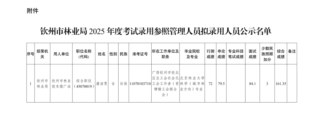 根據(jù)《廣西壯族自治區(qū)2025年度考試錄用公務(wù)員公告》等有關(guān)規(guī)定,我單位2025年計(jì)劃招錄1名參照管理人員,經(jīng)過公開報(bào)名、資格審查、筆試、面試、體檢、考察等程序,擬錄用潘潔雯同志(附件)為參照管理人員,現(xiàn)予以公示。公示期5個(gè)工作日,如對(duì)擬錄用人員的錄用資格有異議,請(qǐng)?jiān)诠酒趦?nèi)向欽州市林業(yè)局辦公室實(shí)名反映。