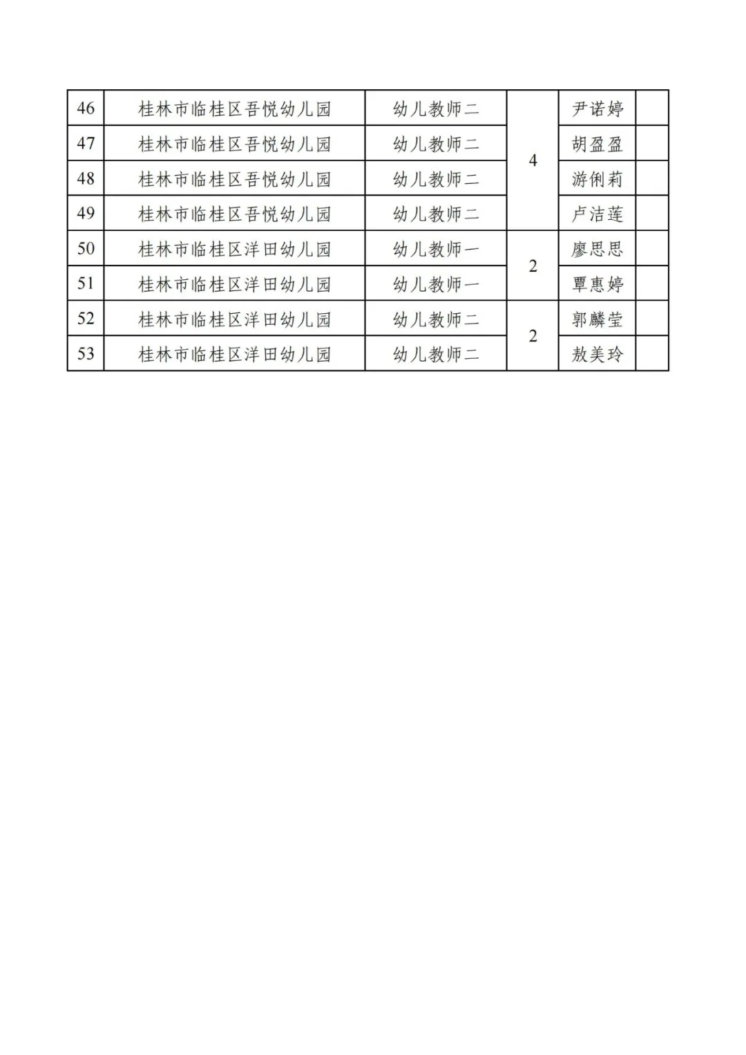 根據(jù)《桂林市2025年度公開招聘中小學教師公告》和《2025年桂林市臨桂區(qū)公開招聘中小學教師面試公告》規(guī)定,經(jīng)網(wǎng)上報名審核、筆試,現(xiàn)場資格復審、面試等程序,現(xiàn)將2025年桂林市臨桂區(qū)公開招聘中小學教師進入考核人員名單予以公示,公示時間為2025年7月21日至25日。公示期間如有異議,請以書面形式并署真實姓名和聯(lián)系方式于7月25日前將反映材料送達臨桂區(qū)委教育工委辦公室或臨桂區(qū)教育局人事股。如實反映有關問題受法律保護。