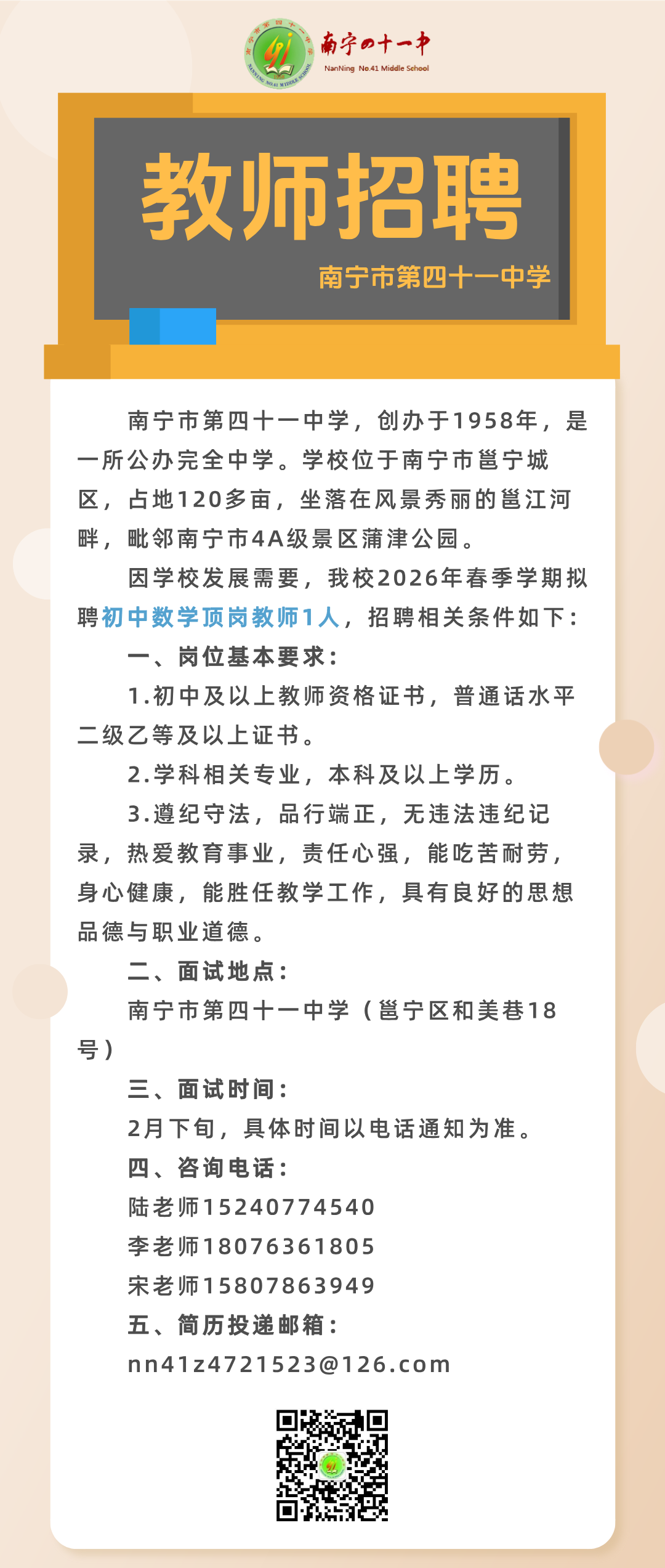 2026年春季學期南寧市第四十一中學關(guān)于公開招聘頂崗教師的啟事