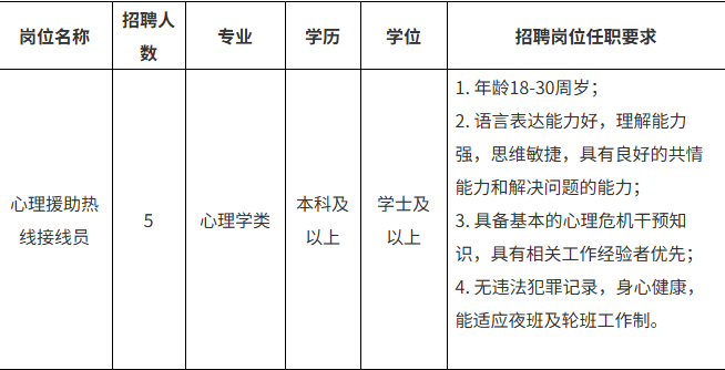 醫(yī)院承接“12356全國(guó)統(tǒng)一心理援助熱線”,提供24小時(shí)不間斷服務(wù)模式,由專(zhuān)職心理咨詢師、心理治療師及精神科醫(yī)護(hù)人員組成專(zhuān)業(yè)團(tuán)隊(duì),為來(lái)電者提供心理教育、心理咨詢、危機(jī)干預(yù)及心理健康科普服務(wù),覆蓋情緒舒緩、家庭關(guān)系、青少年心理咨詢等多類(lèi)問(wèn)題,為自殺高危人群提供快速響應(yīng)與轉(zhuǎn)介服務(wù)。為進(jìn)一步提升心理服務(wù)質(zhì)量、補(bǔ)充現(xiàn)有接線員力量,為公眾提供更優(yōu)質(zhì)、專(zhuān)業(yè)、高效的心理健康服務(wù),現(xiàn)面向社會(huì)招聘5名接線員。