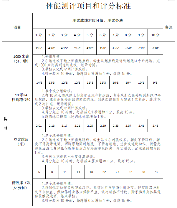 任一單項得分為0的視為“不合格”,予以淘汰。體能測試所有項目均只測試一次,(標準見附件2、附件3)。