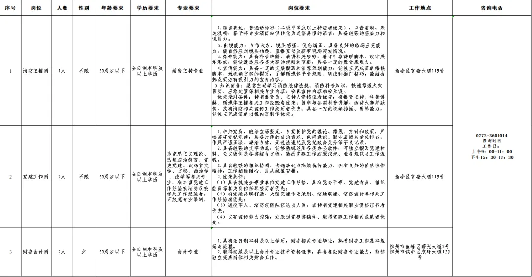 1.各崗位具體要求詳見本公告第一部分“招錄崗位”中的詳細描述。其中,滅火救援、駕駛、通信等一線執(zhí)勤崗位要求為男性,身高165CM以上,雙眼裸視力4.8以上、28周歲以下(有部隊服役經(jīng)歷或者全日制大專及以上學(xué)歷可放寬至30周歲)。